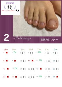 こんにちは。 少し早いですが2月の営業カレンダーです。 寒いので店内暖かくしてお待ちしております。 冬場、かかとが荒れてしまった方、 夏までに、素足をキレイにしたい方、変形した爪をキレイにしたい方、巻き爪を治したい方、 お気軽にご相談下さい。 前のページ 一覧に戻る